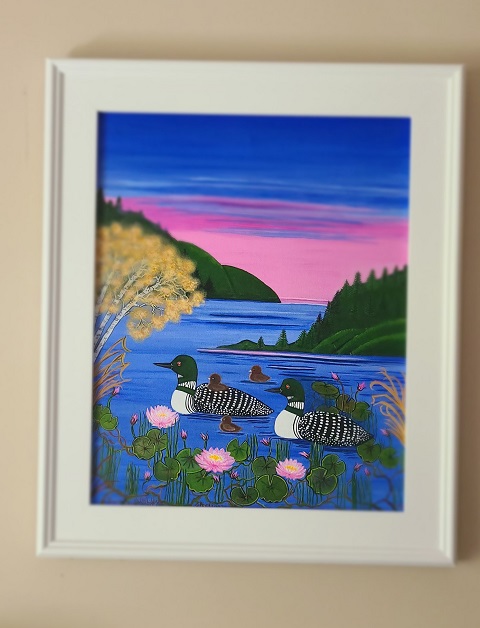 WELL, I FINALLY GOT MY LOON FAMILY PAINTING HUNG. I HAD TO SWAP THE WIRE I HAD FOR ANOTHER TYPE AND THE NAIL FOR MY WALL NEEDED A HEAD. I GOT PERMISSION FROM THE MGMT TO HAMMER IN A NAIL SINCE THE COMMAND HOOKS WERE NOT STURDY ENOUGH FOR THIS PARTICULAR PAINTING. I HAD TO FIGURE OUT HOW TO SCREW IN MY WIRE SO THAT TOOK SOME THINKING AND WORK. HAD PLENTY OF NAILS WITH THE NARROW HEADS TO HANG IT BUT NOT SUITABLE TO BE SURE THE WIRE WON'T SLIP OFF. SO A HUNT WAS ON. THRU MY TOOL BOX FROM STEM TO STERN. THEN IN A COUPLE OF SMALL DRAWERS WHERE I TOSS IN LITTLE OBJECTS LEFTOVER FROM THINGS I BUY. NOPE, NO NAIL WITH A HEAD. FINALLY PAWED THRU MY NAIL BOX A THIRD TIME AND FOUND ONE, YES JUST ONE, SUITABLE NAIL AMONG THOSE WITHOUT HEADS.