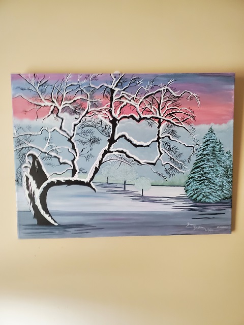 JUDY.......YES, THE ARTWORK IS BY OUR RESIDENT ARTIST. SHE GIVES AWAY HER WORKS TO ALL THE RESIDENTS. SHE FINDS OUT WHAT YOU LIKE AND PAINTS IT. SHE REFUSES ANY MONEY SO THAT'S WHY I MADE HER A WALLHANGING. SHE ALSO GAVE ME THE WINTER PAINTING I HAVE. IT WAS ONLY BECAUSE MY THEN NEIGHBOR DAN DID NOT WANT IT. SHE MADE IT FOR HIM AND SINCE I WAS STANDING THERE IN THE HALLWAY AND SAID IT WAS LOVELY, SHE GAVE IT TO ME. ANYWAY, SHE'S VERY TALENTED. SHE USED TO HAVE AN ART GALLERY.