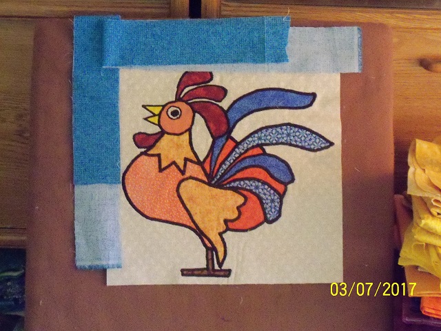 A NEIGHBOR HERE MADE A CHICKEN QUILT FOR HER DAUGHTER WHO HAS CHICKENS FOR EGGS. I HAVE A ROOSTER BLOCK I MADE ABOUT 8 YEARS AGO THAT IS DOING NOTHING BUT TAKING UP SPACE. SHOULD I OFFER IT TO HER AS IS, OR MAKE A PILLOW OUT OF IT. I HAVE THE PILLOW FORMS FOR 16" PILLOWS AND I LIKE TO MAKE THE ONES THAT ARE REMOVABLE TO WASH. DECISIONS, DECISIONS.