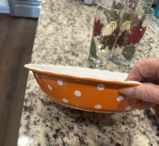 My orange casserole made by Cook's Tools and my vintage glasses. It's oven safe, microwave and freezer safe.